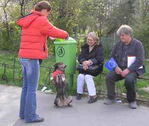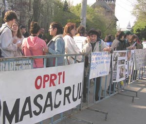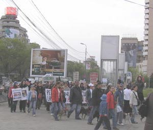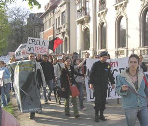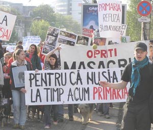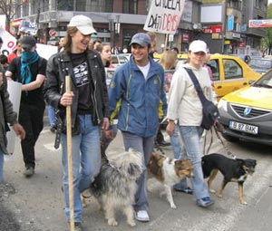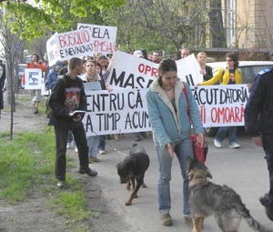 INFORMATII & IMAGINI MITINGURI [ follow up ] Vineri, 5 mai, orele 15, intrare Parcul Cismigiu, in fata Primariei Capitalei DEMONSTRATIE CU CAINI TERAPEUTI prezentata de Vier-Pfoten (caini fara stapan dresati) *** mars de protest *** oameni sandwich *** afise socante *** impotriva programului de exterminare a animalelor fara stapan *** impotriva ordonantei de urgenta propusa de Guvernul Tariceanu PROGRAM: 15 - 16,30 protest in fata Primariei & demonstratia cu catei terapeuti *** 16.30 - 16.45 mars spre Pta. Universitatii (pe partea cu Cercul Militar) *** 16.45 - 17.30 stationare la fantana, Universitate *** 17.30 - 18.30 mars spre Pta. Unirii *** 18.30 - 19.00 stationare in fata Magazinului Unirea Vineri, 14 aprilie, orele 16, Pta.Victoriei, in fata Muzeului Antipa a avut loc miting si mars de protest *** oameni sandwich *** afise socante *** PROGRAM: 16 -17.30 in fata guvernului *** 17.30 - 19 mars spre Pta. Romana *** Pta. Universitatii *** Pta. Unirii Evenimentul a fost organizat de studenti de la facultatile de teatru si film, medicina veterinara si arte plastice. Cheltuielile de organizare au fost suportate exclusiv de catre grupul de voluntari. Nu au fost solicitate fonduri pentru finantarea mitingului nici persoanelor fizice, nici persoanelor juridice. Cei care sunt interesati sa sponsorizeze activitati de protectie a animalelor sau sa doneze procentul de 2% din impozitul datorat, sunt rugati sa aleaga una dintre asociatiile ale caror date de contact le gasiti in acest site (infoUTIL). MULTUMIM: Nania, Diana, Kiki, Rares, Edi, Carmen, Ana - afise, flyere, bannere, mobilizare participanti Dna. Marilena Cristian, asociatia ROBI - aprobare primarie, materiale informative Grupul de dresaj cu catei terapeuti de la VIER PFOTEN, condus de dl. Florin Irimiea Grupul AQVARIUS - pentru atmosfera creata cu ritmuri de tobe si fluiere Dna. Marcela Lungu, asociatia CUTU, CUTU - redactare scrisoare deschisa adresata autoritatilor Dna. Mariana Beck, FNPA - comunicate presa Ne-am dori ca numarul tinerilor studenti prezenti la mitingurile viitoare sa fie din ce in ce mai mare, pentru a arata ca tineretul nu este indiferent si nu se lasa intimidat de politica agresiva a autoritatilor in aceasta problema. |